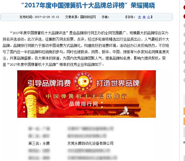 “2017年度中国弹簧机十大品牌评选”是由品牌排行网主办的全网范围最广、规模最大的品牌综合实力排名评选活动。此次评选,征集数万网友投票、点评,经过多轮审核精选出行业品质出众、人气最旺的十大品牌。品牌排行网致力于推动中国消费方式品牌化,构建良好的消费环境。活动创办以来反响热烈,不仅吸引了国内近一半的品牌和经销商的参与,同时也被新浪、网易、新华、中国、搜狐等70多家知名网媒高度关注,共享品牌盛宴。各大媒体的报道,为国内优秀品牌团聚人气,提高品牌知名度、影响力提供契机。