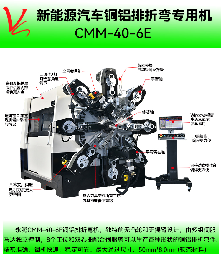 - 产品概述: CMM-40-6E铜排折弯机(最大通过尺寸:50mm*8.0mm)集3D折弯机和弹簧机所有的功能于一体的多功能专用机,本机采用独特的无凸轮和无摇臂设计,由多组伺服马达独立控制,冠军体育首页(中国)科技有限公司官网铜排折弯机广泛应用于导电排成型,新能源电池连接排、新能源电池模组、铜母排成型、硬排成型、导电排、电池连接排、铜排、裸排成型等。精密准确、调机快速、稳定可靠。