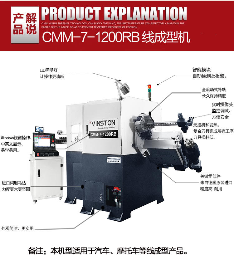 7、适用于汽车、摩托车、飞机、娱乐健身器材、工业设备等大线径线材成形产品。