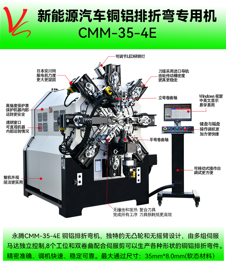 - 产品概述: CMM-35-4E铜排折弯机(最大通过尺寸:35mm*8.0mm)集3D折弯机和弹簧机所有的功能于一体的多功能专用机,本机采用独特的无凸轮和无摇臂设计,由多组伺服马达独立控制,冠军体育首页(中国)科技有限公司官网铜排折弯机广泛应用于导电排成型,新能源电池连接排、新能源电池模组、铜母排成型、硬排成型、导电排、电池连接排、铜排、裸排成型等。精密准确、调机快速、稳定可靠。